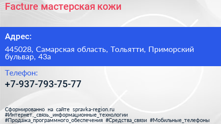 Facture, мастерская кожи по адресу 445028, Самарская область, Тольятти, Приморский бульвар, 43а в дальнейшем Организация, размещена в следующих категориях: