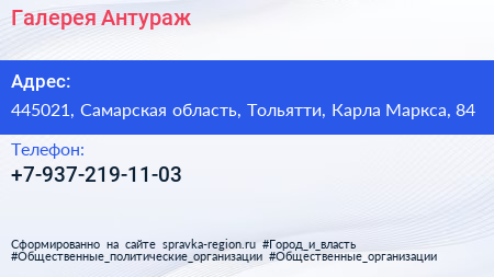 Галерея Антураж по адресу 445021, Самарская область, Тольятти, Карла Маркса, 84 в дальнейшем Организация, размещена в следующих категориях: