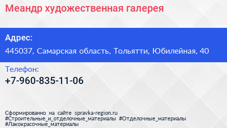Меандр, художественная галерея по адресу 445037, Самарская область, Тольятти, Юбилейная, 40 в дальнейшем Организация, размещена в следующих категориях: