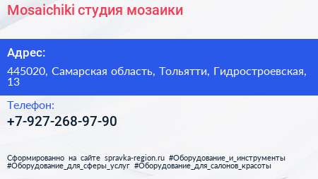 Mosaichiki, студия мозаики по адресу 445020, Самарская область, Тольятти, Гидростроевская, 13 в дальнейшем Организация, размещена в следующих категориях: