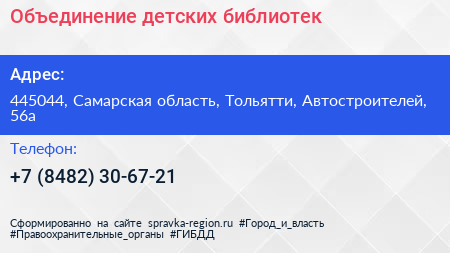 Объединение детских библиотек по адресу 445044, Самарская область, Тольятти, Автостроителей, 56а в дальнейшем Организация, размещена в следующих категориях: