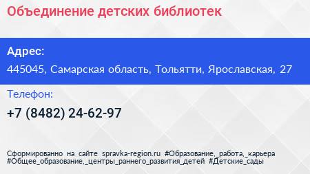 Объединение детских библиотек по адресу 445045, Самарская область, Тольятти, Ярославская, 27 в дальнейшем Организация, размещена в следующих категориях: