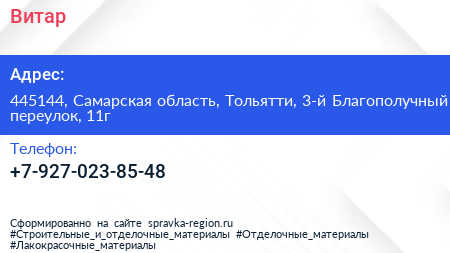 Витар по адресу 445144, Самарская область, Тольятти, 3-й Благополучный переулок, 11г в дальнейшем Организация, размещена в следующих категориях: