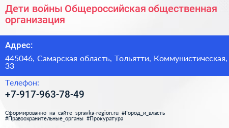 Дети войны, Общероссийская общественная организация по адресу 445046, Самарская область, Тольятти, Коммунистическая, 33 в дальнейшем Организация, размещена в следующих категориях: