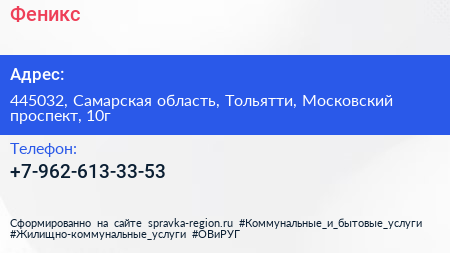 Феникс по адресу 445032, Самарская область, Тольятти, Московский проспект, 10г в дальнейшем Организация, размещена в следующих категориях: