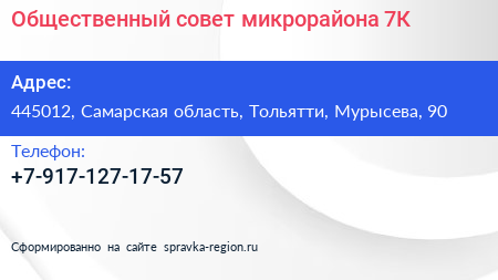 Общественный совет микрорайона №7К по адресу 445012, Самарская область, Тольятти, Мурысева, 90 в дальнейшем Организация, размещена в следующих категориях: