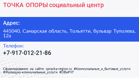 ТОЧКА ОПОРЫ, социальный центр по адресу 445040, Самарская область, Тольятти, бульвар Туполева, 12а в дальнейшем Организация, размещена в следующих категориях: