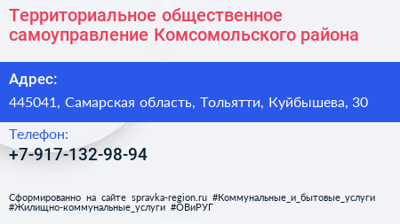 Территориальное общественное самоуправление Комсомольского района по адресу 445041, Самарская область, Тольятти, Куйбышева, 30 в дальнейшем Организация, размещена в следующих категориях: