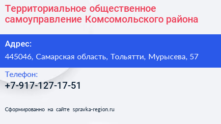 Территориальное общественное самоуправление Комсомольского района по адресу 445046, Самарская область, Тольятти, Мурысева, 57 в дальнейшем Организация, размещена в следующих категориях: