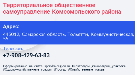 Территориальное общественное самоуправление Комсомольского района по адресу 445012, Самарская область, Тольятти, Коммунистическая, 55 в дальнейшем Организация, размещена в следующих категориях: