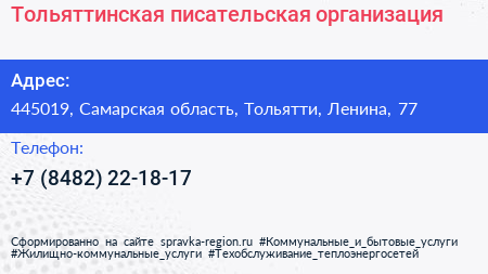 Тольяттинская писательская организация по адресу 445019, Самарская область, Тольятти, Ленина, 77 в дальнейшем Организация, размещена в следующих категориях: