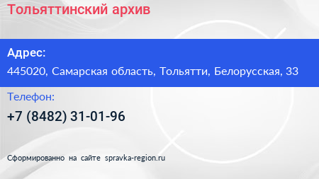 Тольяттинский архив по адресу 445020, Самарская область, Тольятти, Белорусская, 33 в дальнейшем Организация, размещена в следующих категориях: