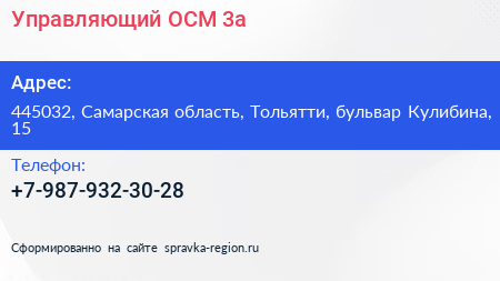Управляющий ОСМ №3а по адресу 445032, Самарская область, Тольятти, бульвар Кулибина, 15 в дальнейшем Организация, размещена в следующих категориях:
