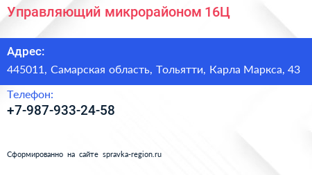 Управляющий микрорайоном 16Ц по адресу 445011, Самарская область, Тольятти, Карла Маркса, 43 в дальнейшем Организация, размещена в следующих категориях: