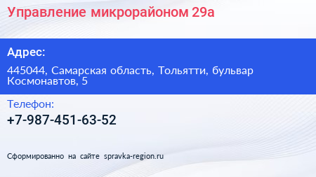 Управление микрорайоном 29а по адресу 445044, Самарская область, Тольятти, бульвар Космонавтов, 5 в дальнейшем Организация, размещена в следующих категориях: