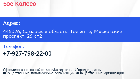 5ое Колесо по адресу 445026, Самарская область, Тольятти, Московский проспект, 26 ст2 в дальнейшем Организация, размещена в следующих категориях: