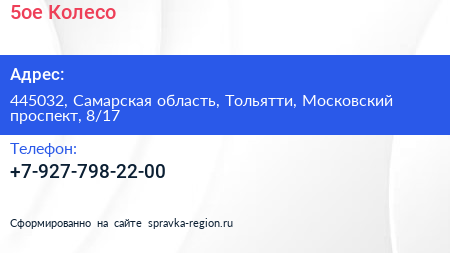 5ое Колесо по адресу 445032, Самарская область, Тольятти, Московский проспект, 8/17 в дальнейшем Организация, размещена в следующих категориях: