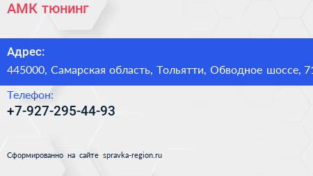 АМК-тюнинг по адресу 445000, Самарская область, Тольятти, Обводное шоссе, 71 в дальнейшем Организация, размещена в следующих категориях: