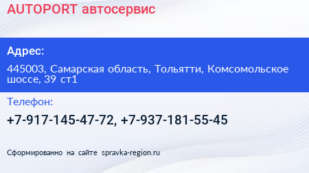 AUTOPORT, автосервис по адресу 445003, Самарская область, Тольятти, Комсомольское шоссе, 39 ст1 в дальнейшем Организация, размещена в следующих категориях: