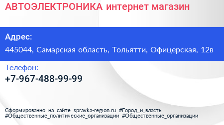 АВТОЭЛЕКТРОНИКА, интернет-магазин по адресу 445044, Самарская область, Тольятти, Офицерская, 12в в дальнейшем Организация, размещена в следующих категориях: