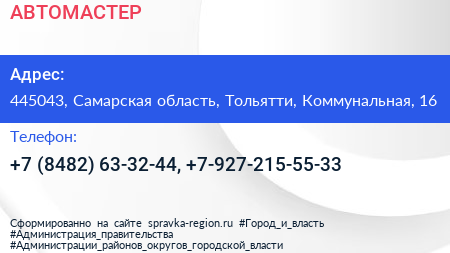 АВТОМАСТЕР по адресу 445043, Самарская область, Тольятти, Коммунальная, 16 в дальнейшем Организация, размещена в следующих категориях:
