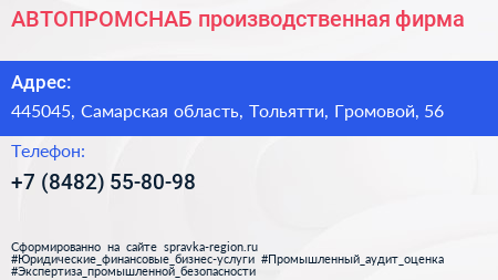 АВТОПРОМСНАБ, производственная фирма по адресу 445045, Самарская область, Тольятти, Громовой, 56 в дальнейшем Организация, размещена в следующих категориях: