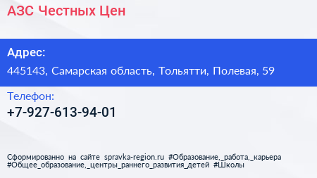 АЗС Честных Цен по адресу 445143, Самарская область, Тольятти, Полевая, 59 в дальнейшем Организация, размещена в следующих категориях: