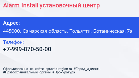 Alarm Install, установочный центр по адресу 445000, Самарская область, Тольятти, Ботаническая, 7а в дальнейшем Организация, размещена в следующих категориях: