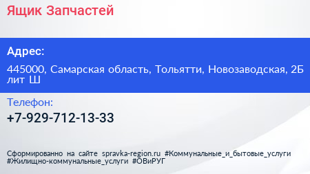 Ящик Запчастей по адресу 445000, Самарская область, Тольятти, Новозаводская, 2Б лит Ш в дальнейшем Организация, размещена в следующих категориях:
