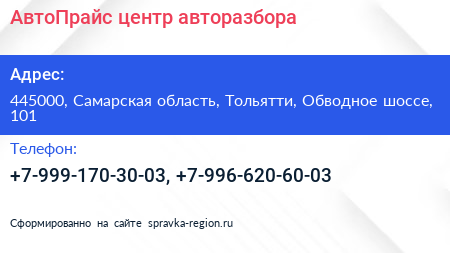 АвтоПрайс, центр авторазбора по адресу 445000, Самарская область, Тольятти, Обводное шоссе, 101 в дальнейшем Организация, размещена в следующих категориях: