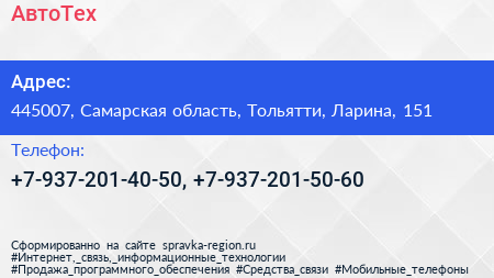 АвтоТех по адресу 445007, Самарская область, Тольятти, Ларина, 151 в дальнейшем Организация, размещена в следующих категориях: