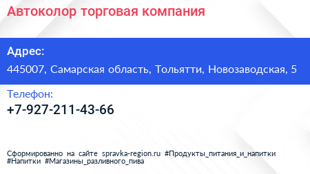 Автоколор, торговая компания по адресу 445007, Самарская область, Тольятти, Новозаводская, 5 в дальнейшем Организация, размещена в следующих категориях: