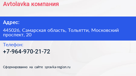 Avtolavka, компания по адресу 445026, Самарская область, Тольятти, Московский проспект, 20 в дальнейшем Организация, размещена в следующих категориях:
