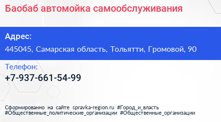 Баобаб, автомойка самообслуживания по адресу 445045, Самарская область, Тольятти, Громовой, 90 в дальнейшем Организация, размещена в следующих категориях: