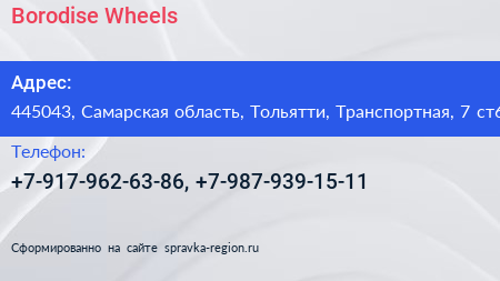 Borodise Wheels по адресу 445043, Самарская область, Тольятти, Транспортная, 7 ст6 в дальнейшем Организация, размещена в следующих категориях: