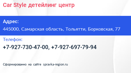 Car Style, детейлинг-центр по адресу 445000, Самарская область, Тольятти, Борковская, 77 в дальнейшем Организация, размещена в следующих категориях: