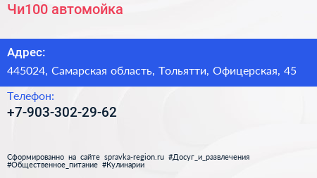 Чи100, автомойка по адресу 445024, Самарская область, Тольятти, Офицерская, 45 в дальнейшем Организация, размещена в следующих категориях: