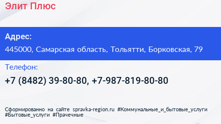 Элит Плюс по адресу 445000, Самарская область, Тольятти, Борковская, 79 в дальнейшем Организация, размещена в следующих категориях: