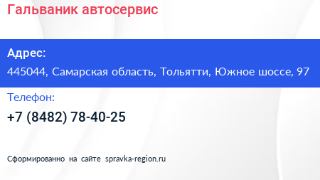 Гальваник, автосервис по адресу 445044, Самарская область, Тольятти, Южное шоссе, 97 в дальнейшем Организация, размещена в следующих категориях: