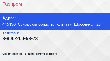 Газпром по адресу 445130, Самарская область, Тольятти, Шоссейная, 28 в дальнейшем Организация, размещена в следующих категориях: