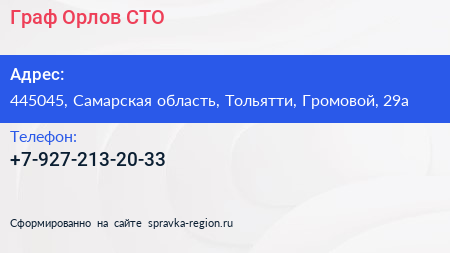Граф Орлов, СТО по адресу 445045, Самарская область, Тольятти, Громовой, 29а в дальнейшем Организация, размещена в следующих категориях: