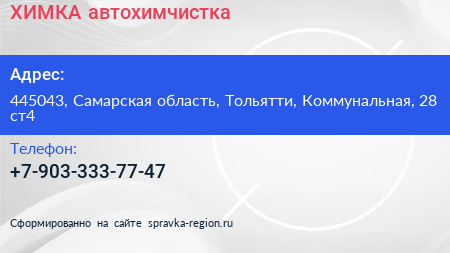 ХИМКА, автохимчистка по адресу 445043, Самарская область, Тольятти, Коммунальная, 28 ст4 в дальнейшем Организация, размещена в следующих категориях: