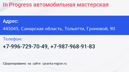 In Progress, автомобильная мастерская по адресу 445045, Самарская область, Тольятти, Громовой, 90 в дальнейшем Организация, размещена в следующих категориях: