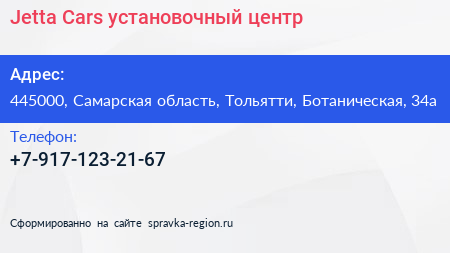 Jetta Cars, установочный центр по адресу 445000, Самарская область, Тольятти, Ботаническая, 34а в дальнейшем Организация, размещена в следующих категориях: