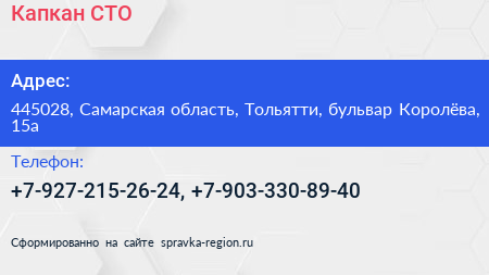 Капкан, СТО по адресу 445028, Самарская область, Тольятти, бульвар Королёва, 15а в дальнейшем Организация, размещена в следующих категориях: