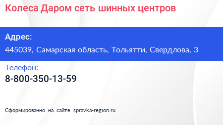 Колеса Даром, сеть шинных центров по адресу 445039, Самарская область, Тольятти, Свердлова, 3 в дальнейшем Организация, размещена в следующих категориях: