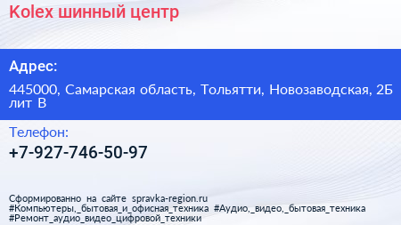 Kolex, шинный центр по адресу 445000, Самарская область, Тольятти, Новозаводская, 2Б лит В в дальнейшем Организация, размещена в следующих категориях: