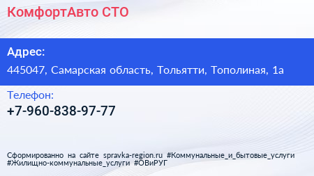 КомфортАвто, СТО по адресу 445047, Самарская область, Тольятти, Тополиная, 1а в дальнейшем Организация, размещена в следующих категориях: