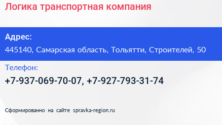 Логика, транспортная компания по адресу 445140, Самарская область, Тольятти, Строителей, 50 в дальнейшем Организация, размещена в следующих категориях: