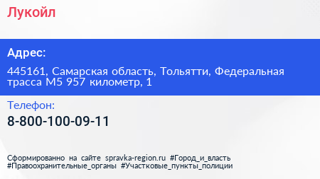 Лукойл по адресу 445161, Самарская область, Тольятти, Федеральная трасса М5 957 километр, 1 в дальнейшем Организация, размещена в следующих категориях: